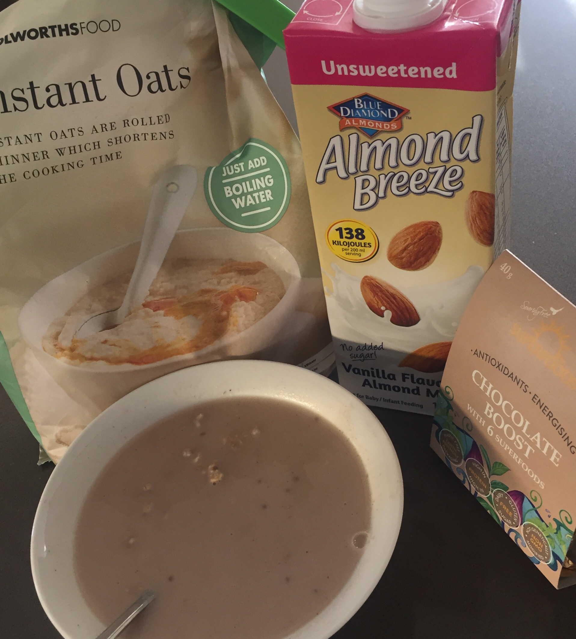 Delicious breakfast using Woolworths Instant Oats and Almond Breeze vanilla flavored Almond Milk, with Chocolate boost.